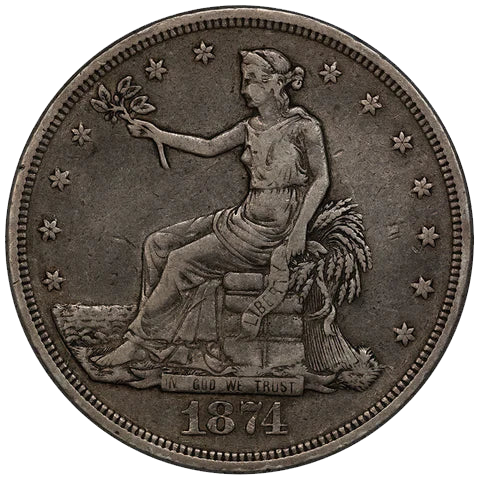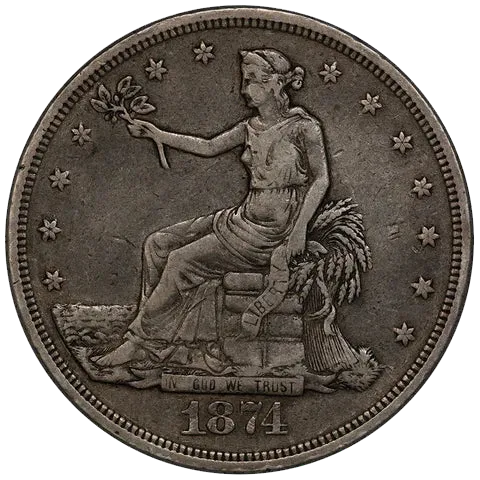 In a year when its production of other denominations was rather small, the Carson City Mint struck well over a million trade dollars. In fact, only the following year saw a larger number of CC trades. Just small batches of four or five figures were produced each month until August, when production really too off. The numbers advanced steadily from 145,000 pieces that month to a peak in December with some 240,000 trade dollars struck. Most of these coins were shipped to the Orient, as was the intention when authorized by Congress. Trade dollars of various nations circulated to some extent there as late as the 1940s, mostly being traded in bulk as just so much silver bullion. The newly established People's Republic frowned on the use of gold and silver in trade, and these coins began to be surreptitiously smuggled out to the West. Large numbers were repatriated to the United States in the 1950s, but most of these coins were worn, damaged and/or chop marked. Nice circulated examples are very scarce, as are Mint State coins of average quality. Gems are extremely rare, probably more so that the certified populations suggest. Three different sizes/styles of the CC mintmark were used for this year's production. Trade dollars are not widely collected by varieties, but such naked eye distinctions make them rather appealing.