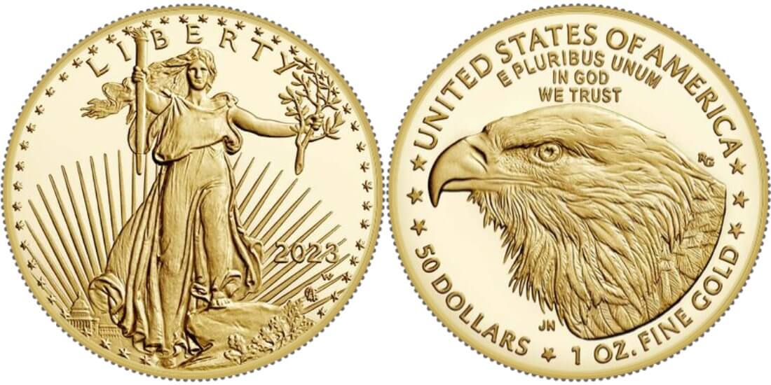 2023 American Eagles 2021 marked the 35th anniversary of the American Eagle coin program and the introduction of new designs. Mint Artistic Infusion Program (AIP) designer Jennie Norris created the new Gold coin design sculpted by Mint Medallic Artist Renata Gordon. The new reverse design features a portrait of an eagle. The obverse has been revised with additional detail from the original design by Augustus Saint-Gaudens to enhance this classic image that has been a part of American history since the early 1900s.