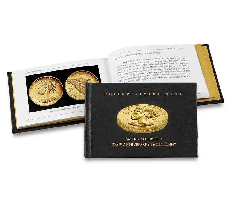American Liberty 225th Anniversary Gold Coins are minted in 99.99% 24–karat gold, in high–relief, with raised edge lettering, and a proof finish. Each coin is hand packaged in an exquisite, black lacquered hardwood presentation case and is accompanied by a companion booklet detailing the evolution of our Nation’s symbol.